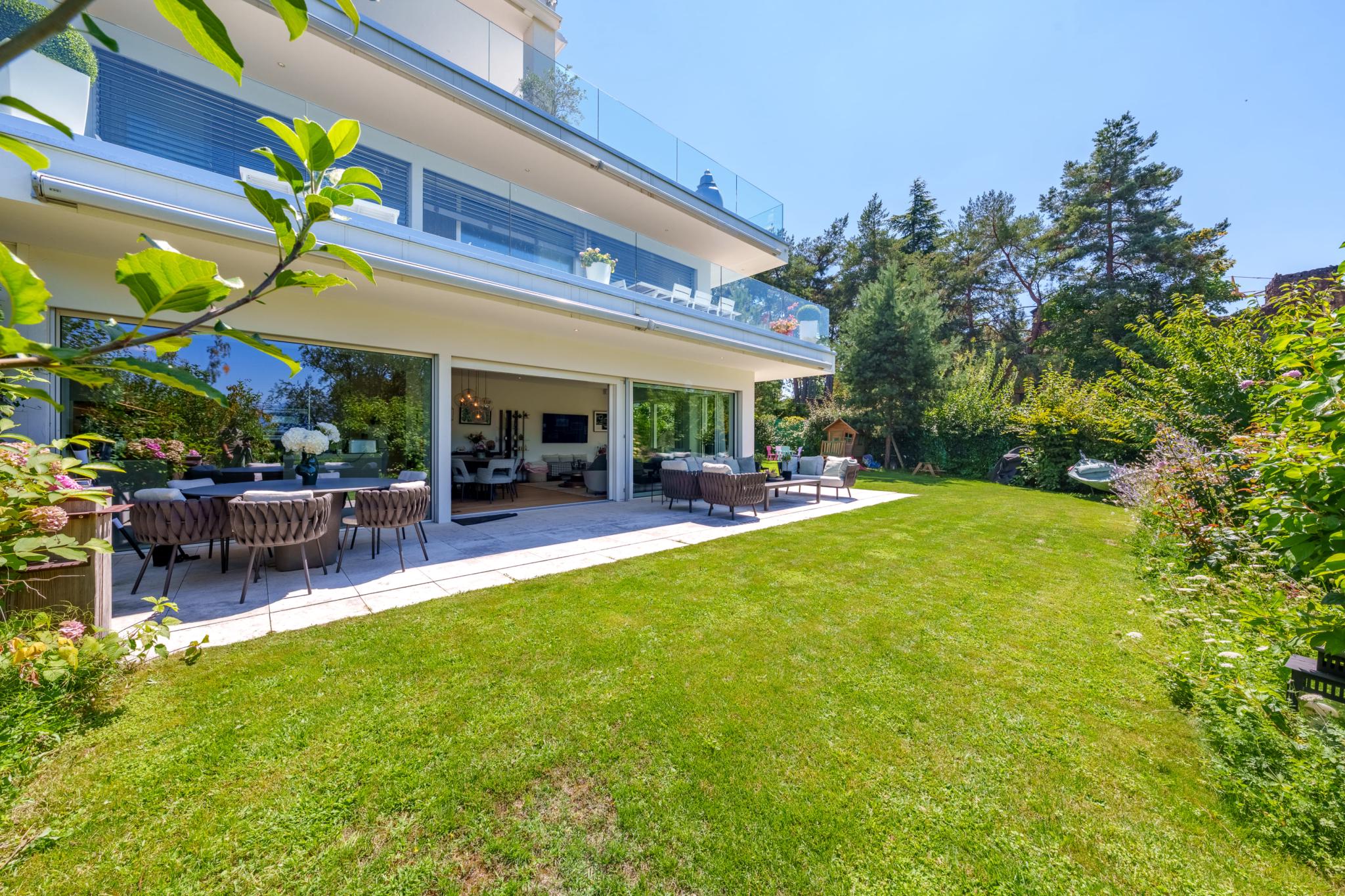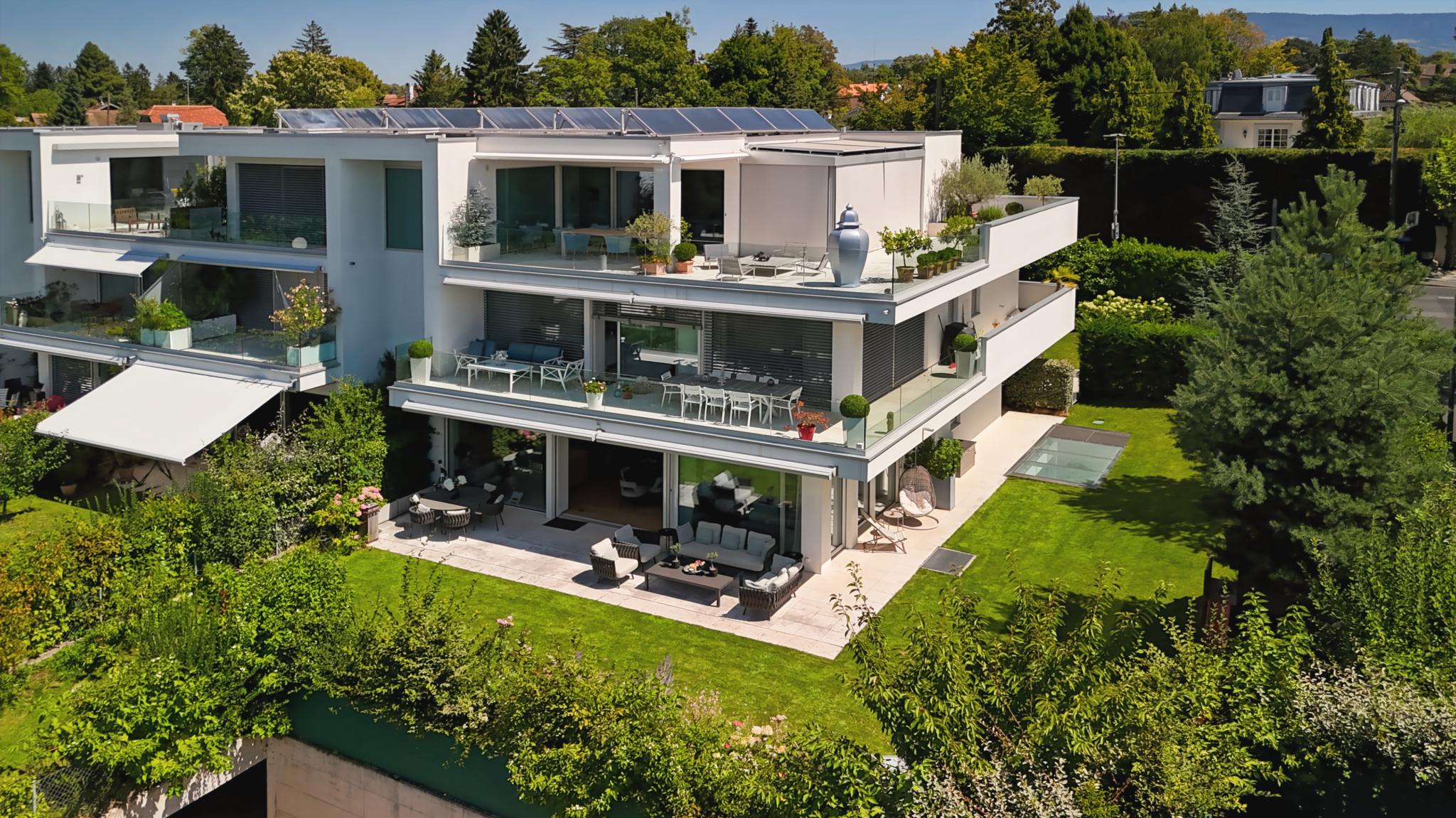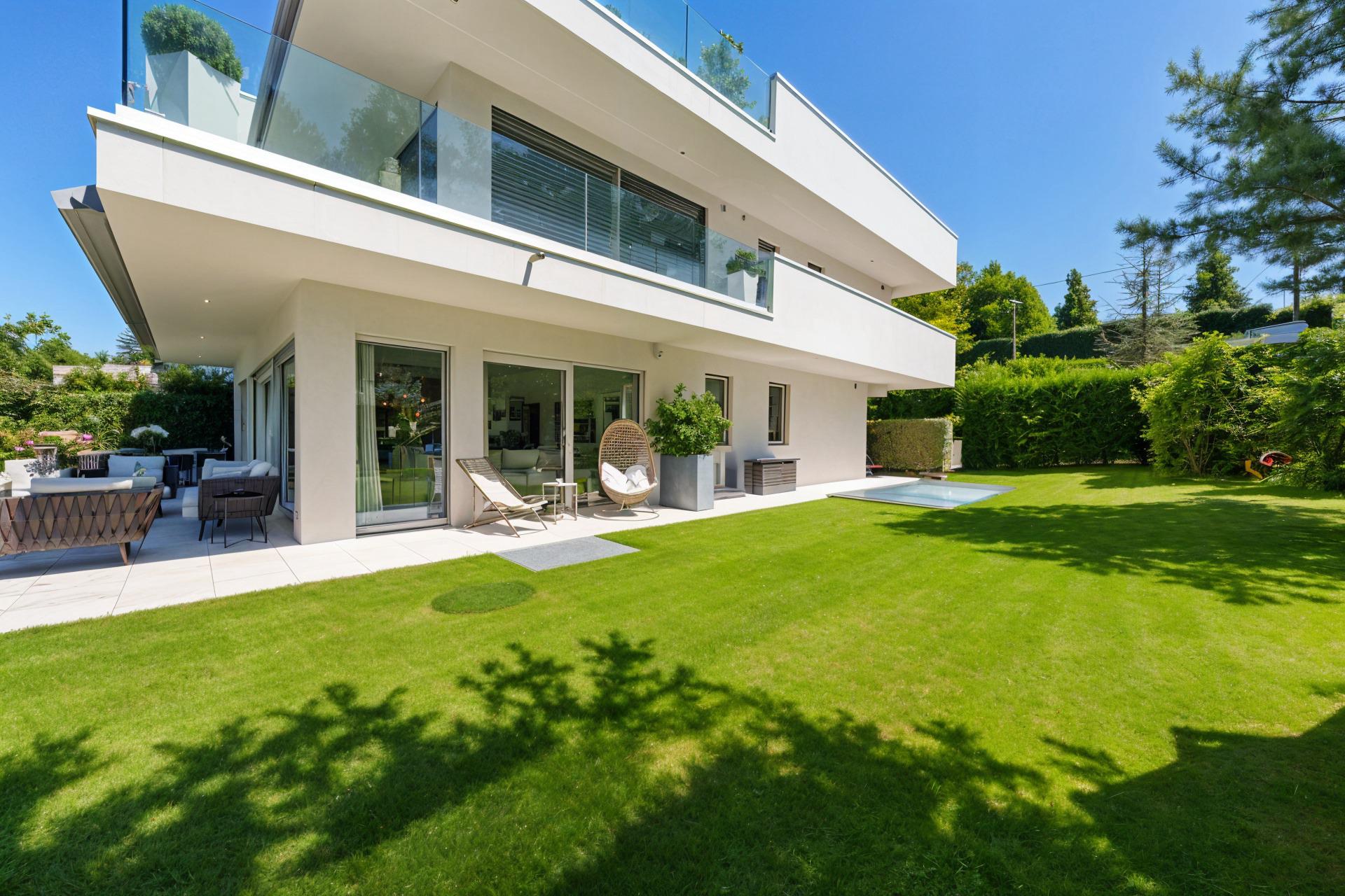 Located in the heart of Vésenaz, discover this 5-room apartment with a total weighted surface area of 190 m² (143 m² PPE), featuring a large terrace and a lovely landscaped garden.