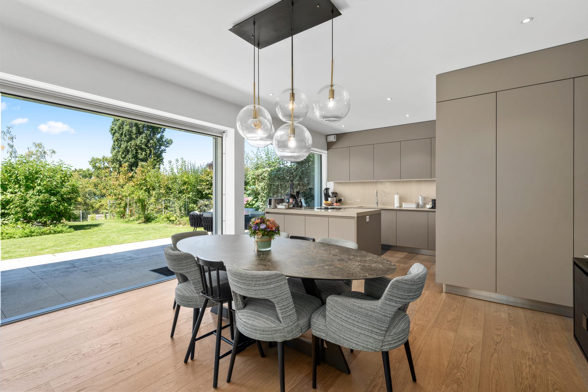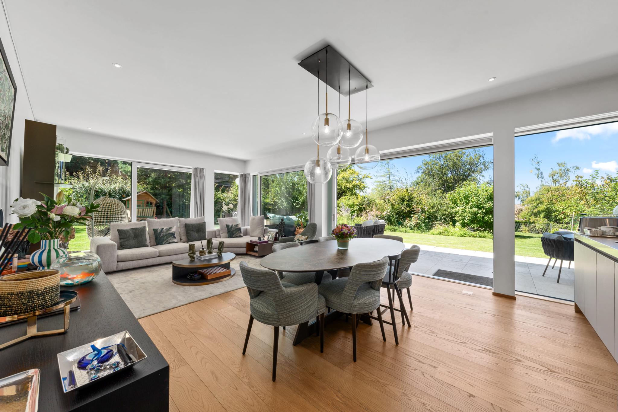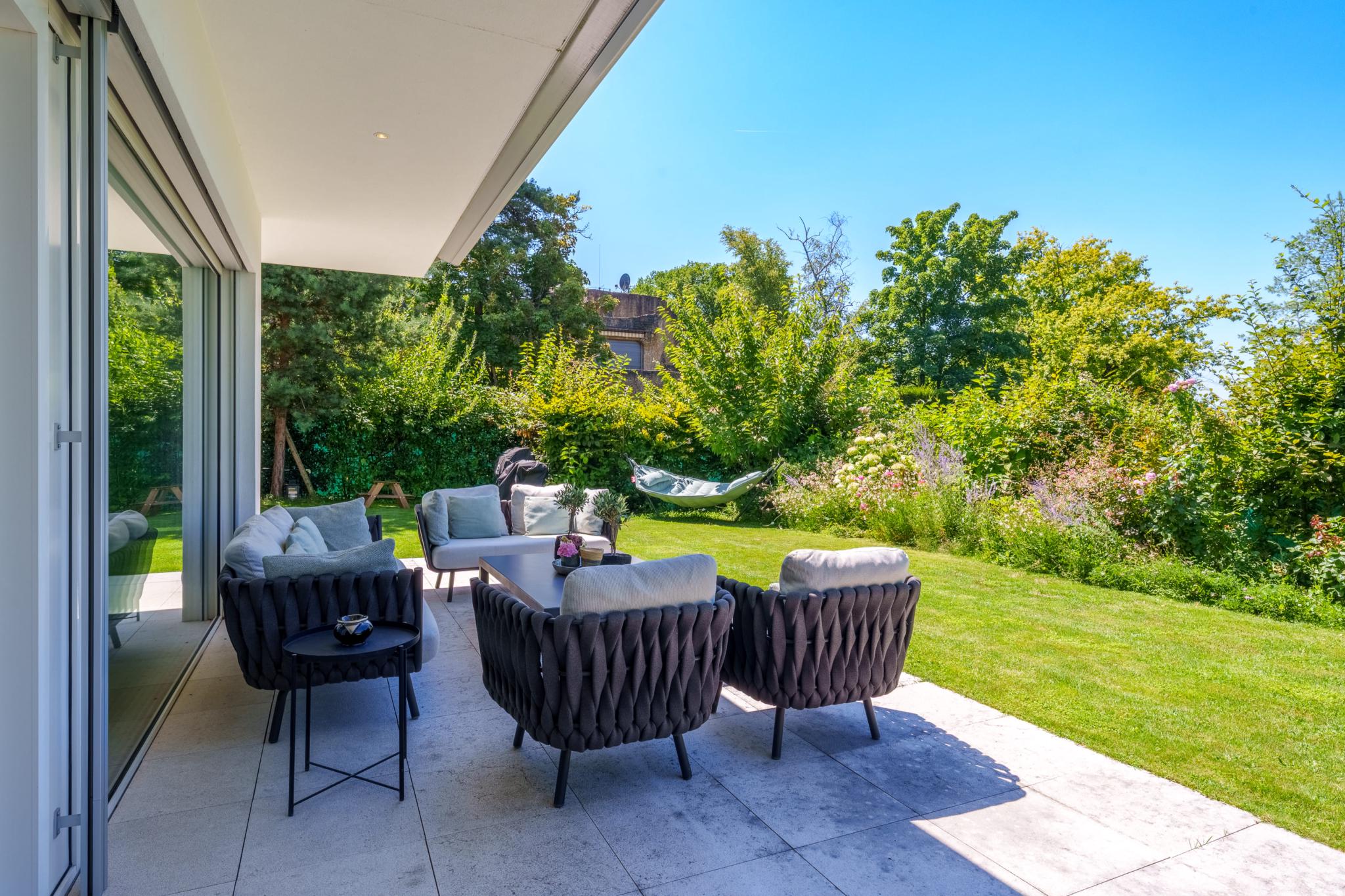 Located in the heart of Vésenaz, discover this 5-room apartment with a total weighted surface area of 190 m² (143 m² PPE), featuring a large terrace and a lovely landscaped garden.