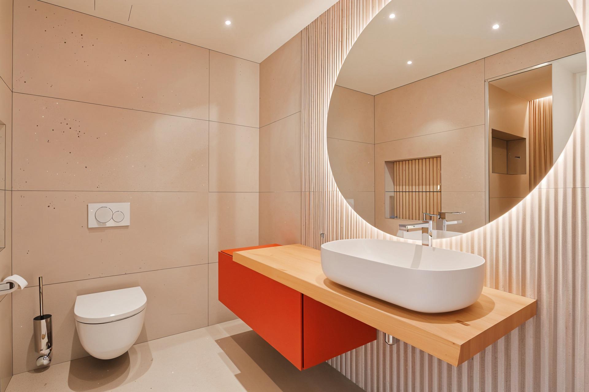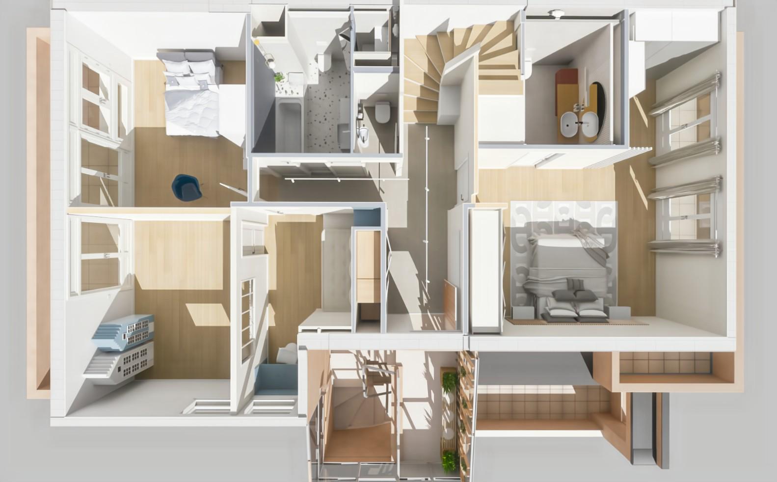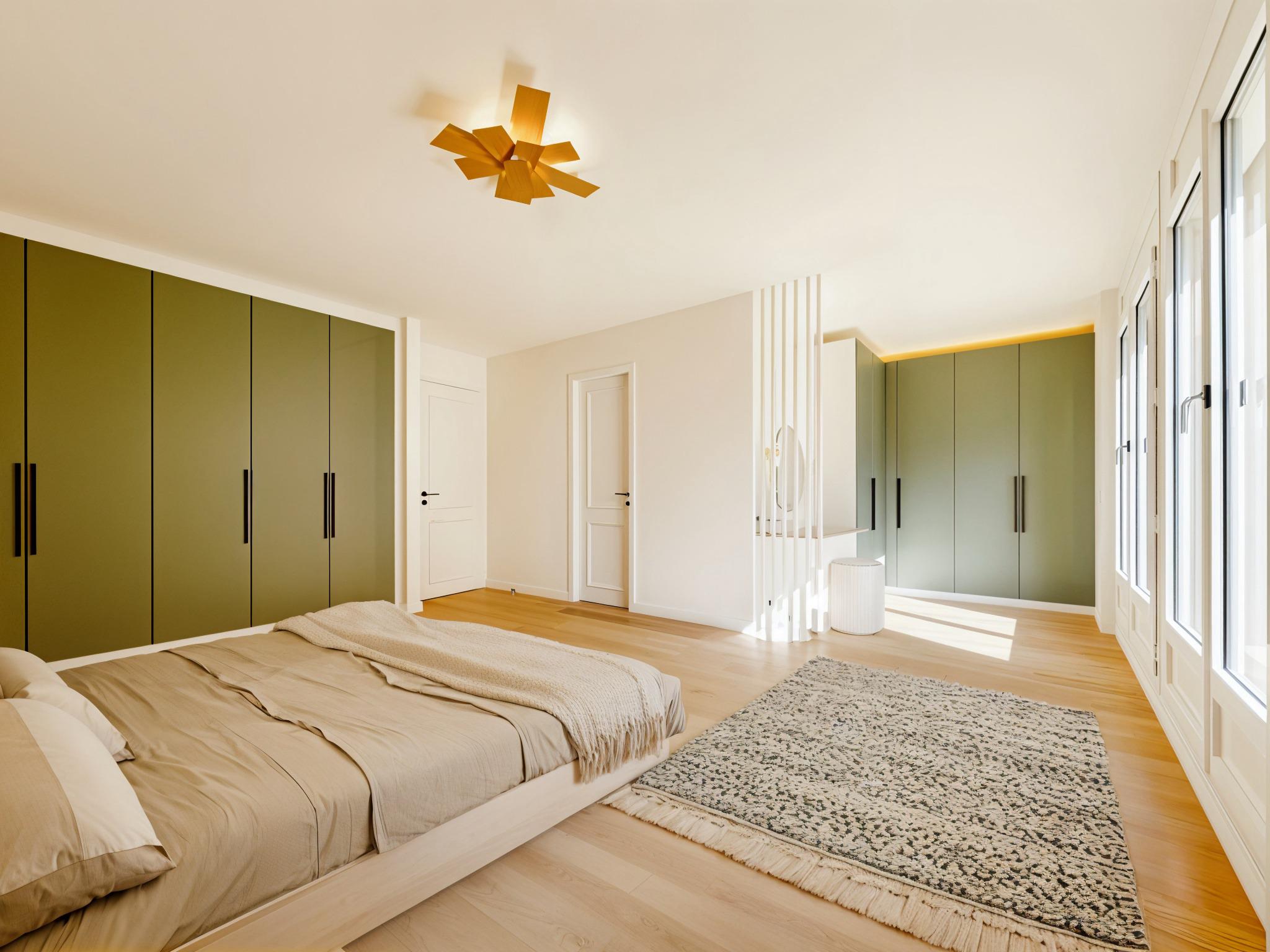 The first floor, with a PPE surface of 119 m2, is composed of three bedrooms, including a beautiful master suite with dressing room and modern bathroom for a feeling of absolute well-being. A children’s bathroom including a laundry area, as well as a guest toilet were designed to enhance these spaces. Each of the bedrooms has private access to balconies and spacious wall cupboards.